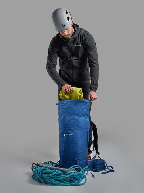 The continuous webbing construction throughout the multi-day pack provides 360 degree compression and stability to make sure your kit is secure on long days in the mountains. The back panel and harness are moulded and body formed with a pre-shaped aluminium stave for a close, secure load carry and excellent stability during dynamic activities