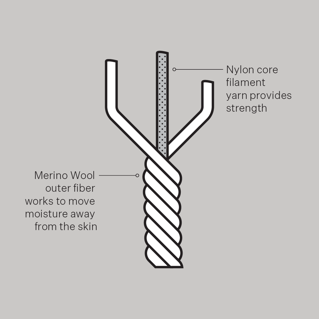 Our core spun merino wool fibre allows for a significantly lower-weight fabric, while maintaining strength and performance. A nylon core for strength and dimensional stability is wrapped with fine merino wool.